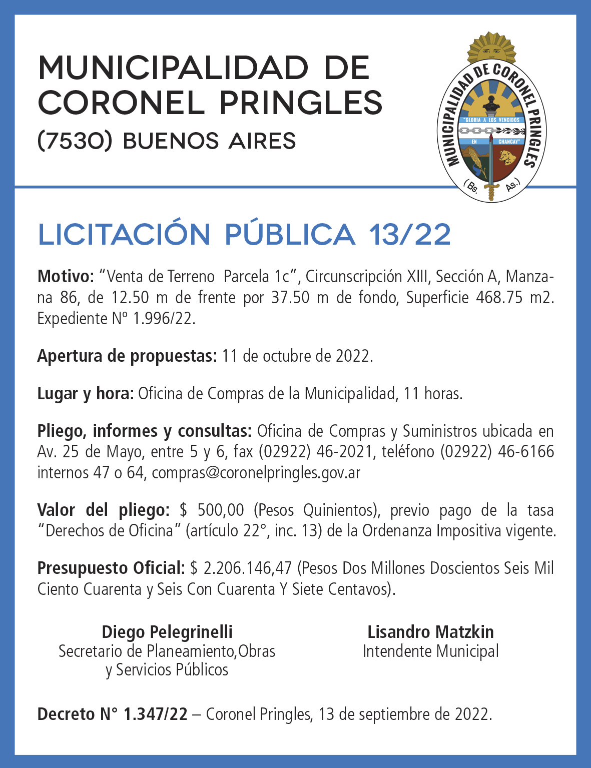 Decreto N° 1.347/22 – Coronel Pringles, 13 de septiembre de 2022.