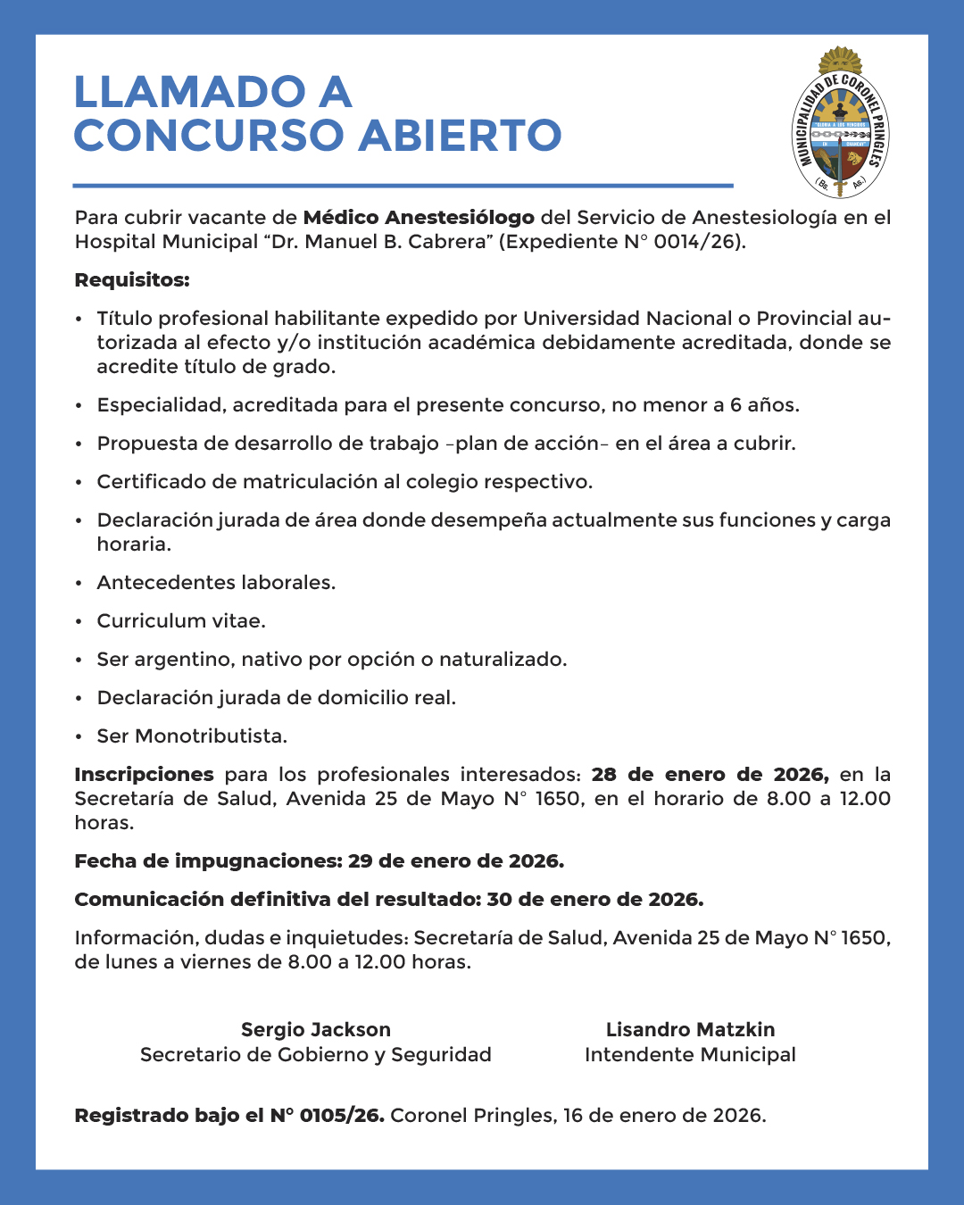 Registrado bajo el N° 0105/26. Coronel Pringles, 16 de enero de 2026.