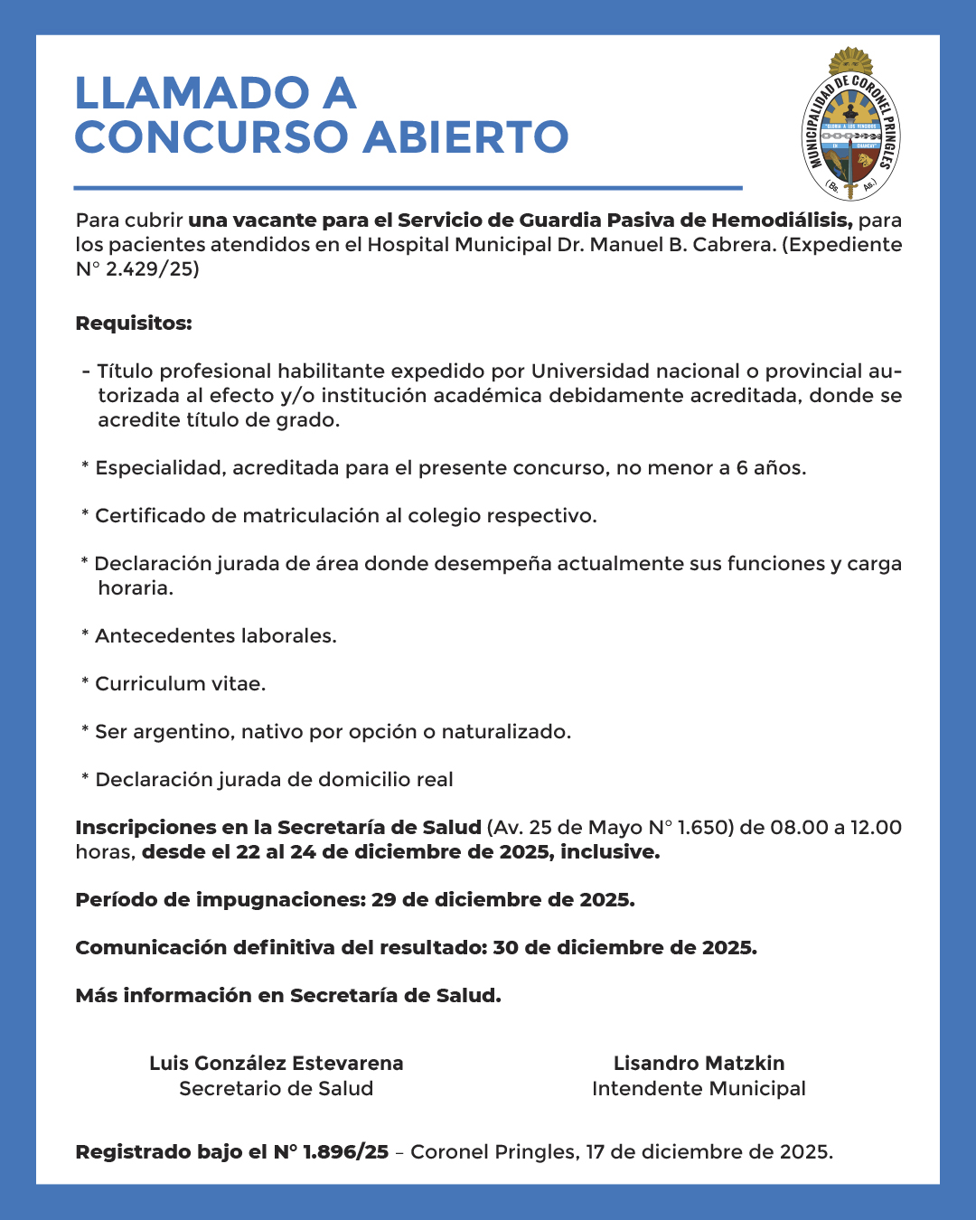 Para cubrir una vacante para el Servicio de Guardia Pasiva de Hemodiálisis, para los pacientes atendidos en el Hospital Municipal Dr. Manuel B. Cabrera. (Expediente N° 2.429/25)