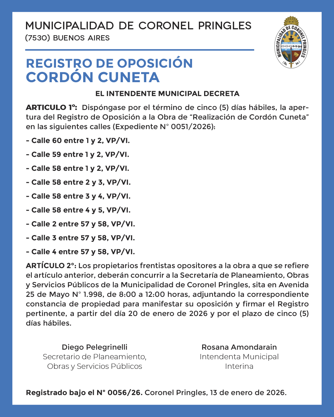 Registrado bajo el Nº 0056/26. Coronel Pringles, 13 de enero de 2026.