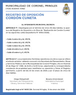 ARTÍCULO 2°: Los propietarios frentistas opositores a la obra a que se refiere el artículo anterior, deberán concurrir a la Secretaría de Planeamiento, Obras y Servicios Públicos de la Municipalidad de Coronel Pringles, sita en Avenida 25 de Mayo Nº 1.998, de 8:00 a 12:00 horas, adjuntando la correspondiente constancia de propiedad para manifestar su oposición y firmar el Registro pertinente, a partir del día 20 de enero de 2026 y por el plazo de cinco (5) días hábiles.