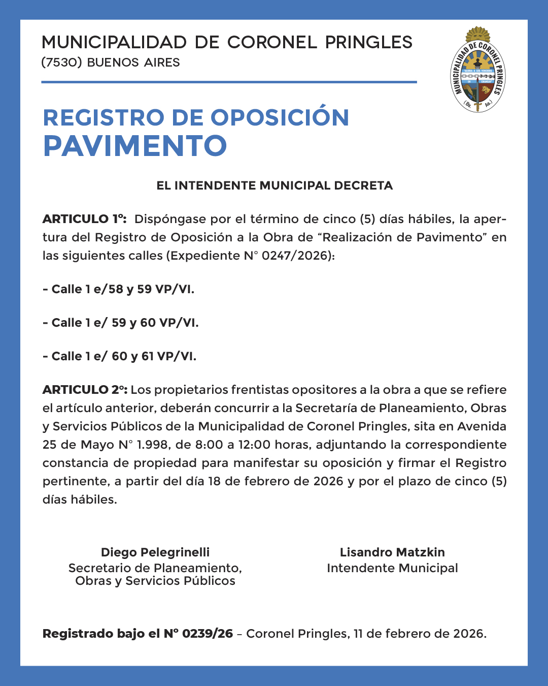 Registrado bajo el Nº 0239/26 – Coronel Pringles, 11 de febrero de 2026.